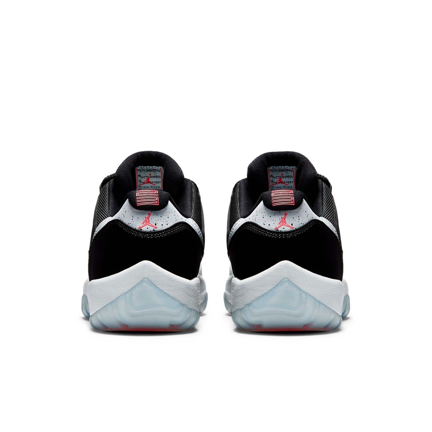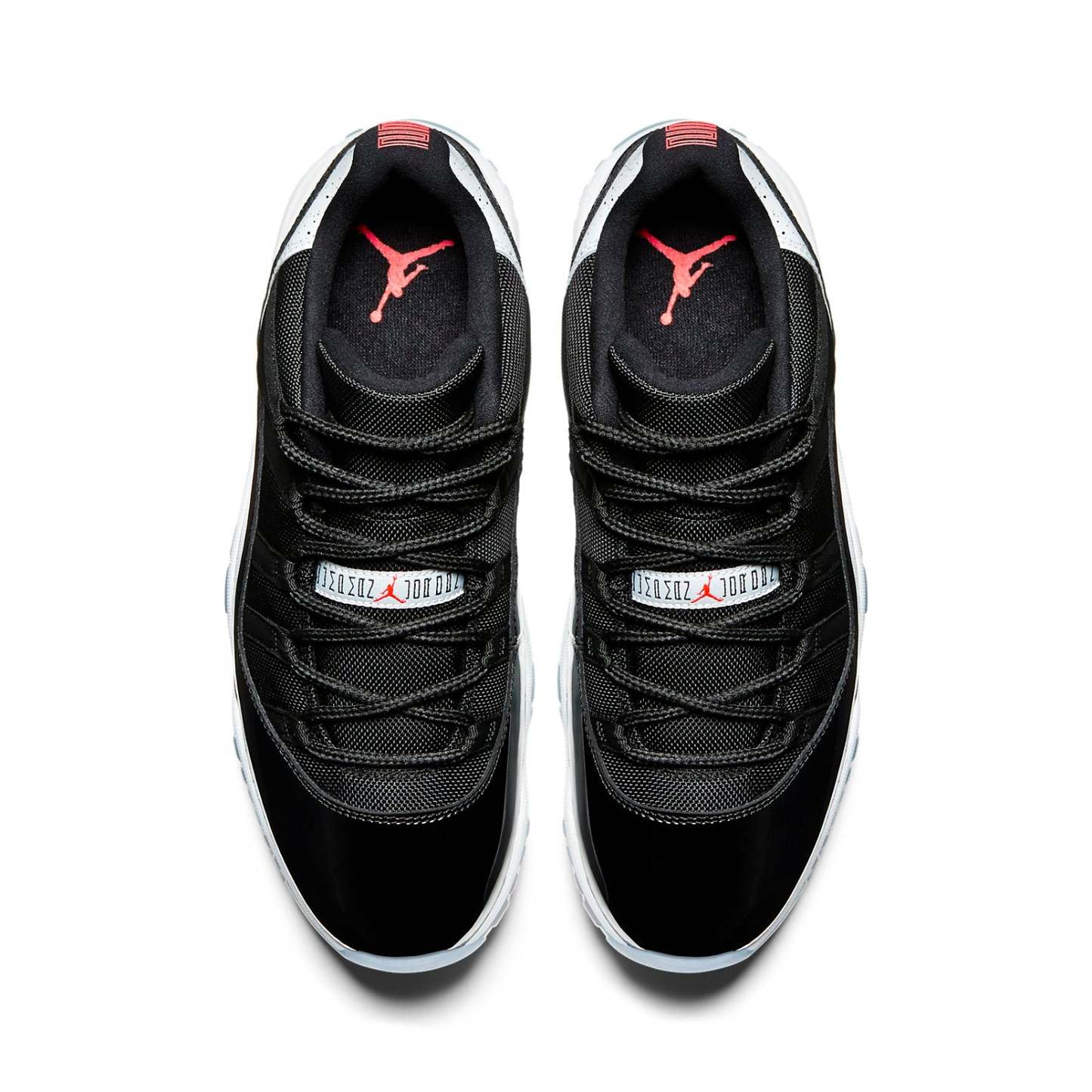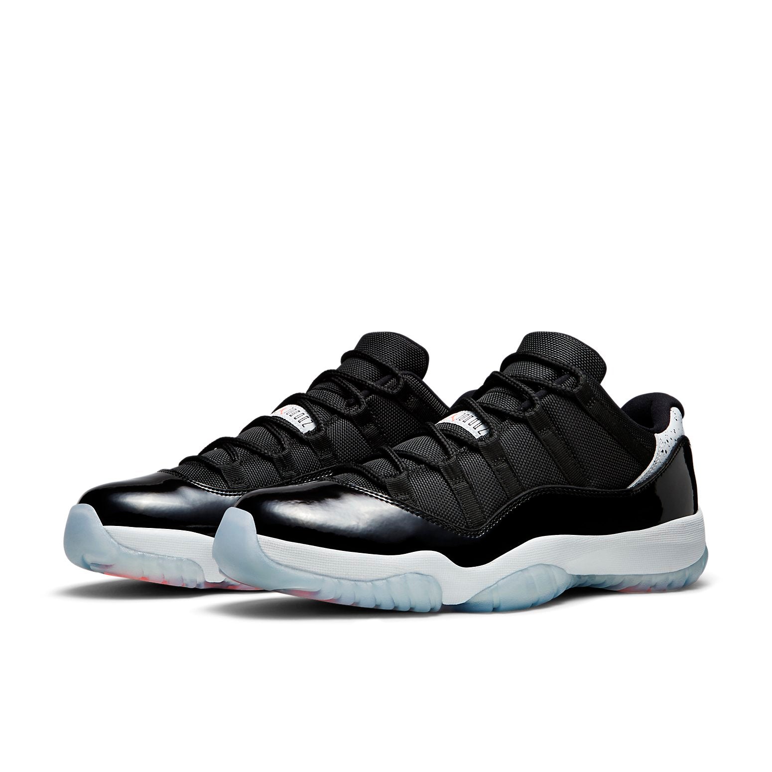 The Air Jordan 11 Retro Low "Infrared 23" sports vibrant accents on a largely neutral look. The shoe"s low-top upper appears with a black mesh base, overlaid by black patent leather on the mudguard. Speckled detailing accents the leather heel overlay, while the heel, as well as the tongue, highlight the design in Infrared 23. Underfoot, a contrasting white phylon midsole provides cushioning, giving way to a translucent rubber outsole that incorporates herringbone pods for traction.
