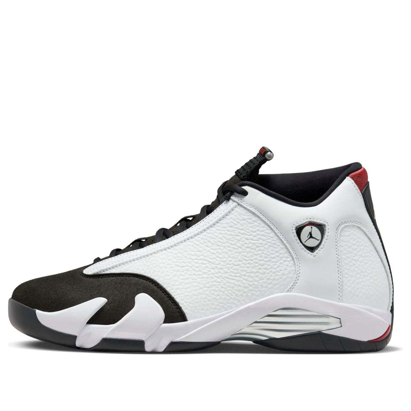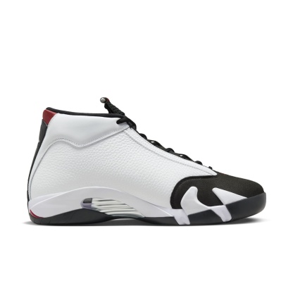 The Air Jordan 14 "Black Toe" returns in November 2024, featuring a classic white leather upper with black suede accents for a bold, iconic look. This re-release pays homage to the original 1998 design, incorporating the signature Ferrari-inspired Jumpman branding and metallic aglets. The Air Jordan 14 offers both style and performance with a Phylon midsole, chrome-plated shank plate, and Zoom Air units for stability and responsive cushioning.