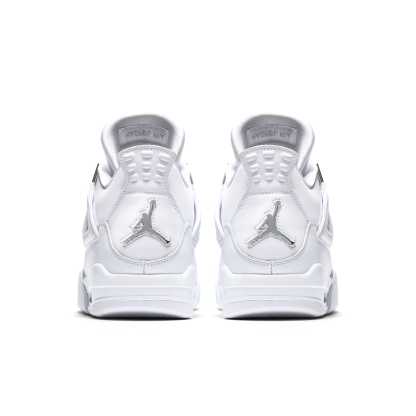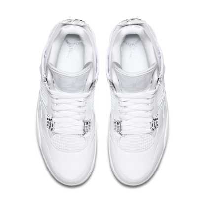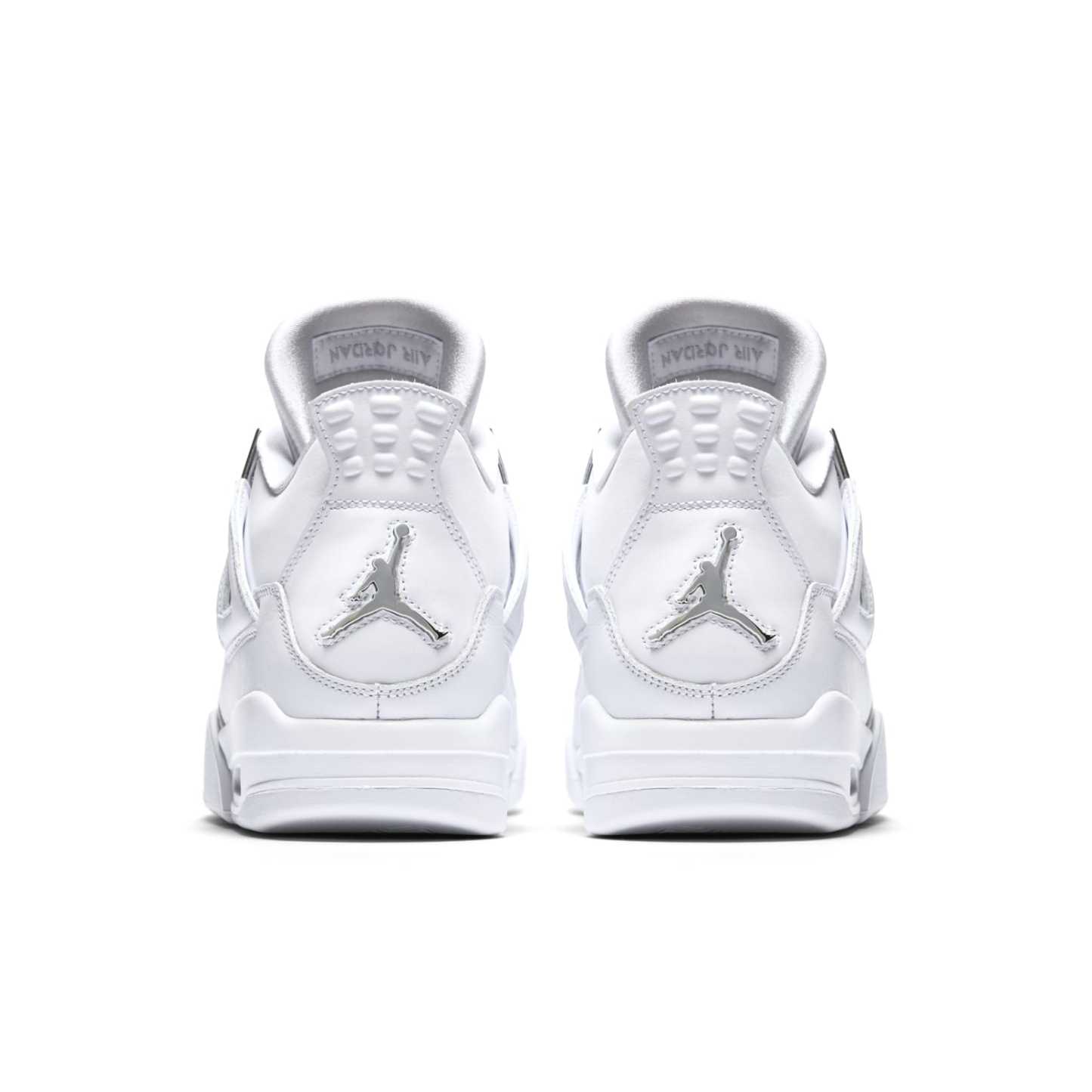 The Air Jordan 4 Retro is a retro version of the classic Air Jordan 4. Released in 2017, this sneaker features a white leather upper with a white rubber sole. First introduced in 2006, this 2017 version of the shoe also includes chrome eyelets, a chrome Jumpman on the heel, and ‘Pure$’ stitched on the inside of the back tabs - a clear reference to the retail price point of these shoes. Despite their high price tag, the Air Jordan 4 Retro is still one of the most popular sneakers on the market, due to its clean lines and timeless design.