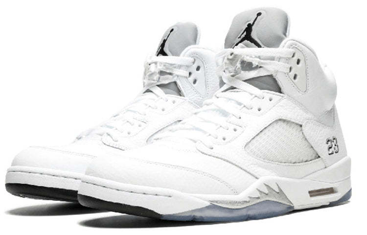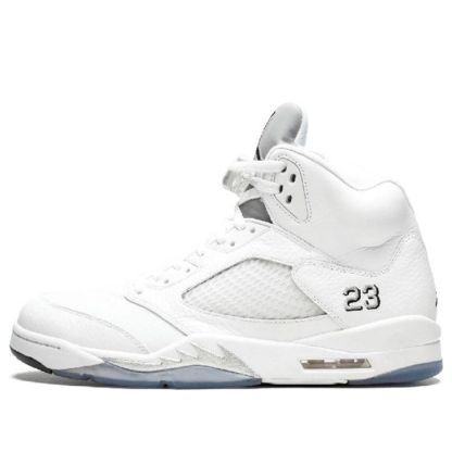 The Air Jordan 5 Retro 'Metallic White' 2015 is a remastered version of the classic colorway first released in 2000. The sneaker features a white tumbled leather upper with metallic silver and black accents on an ice blue translucent outsole. This retro release is sure to please fans of the Air Jordan 5, and is a must-have for any collector. With its clean and simple design, the Air Jordan 5 Retro 'Metallic White' 2015 is a versatile sneaker that can be worn with any outfit. Whether you're hitting the court or just hitting the streets, the Air Jordan 5 Retro 'Metallic White' 2015 is a great choice.