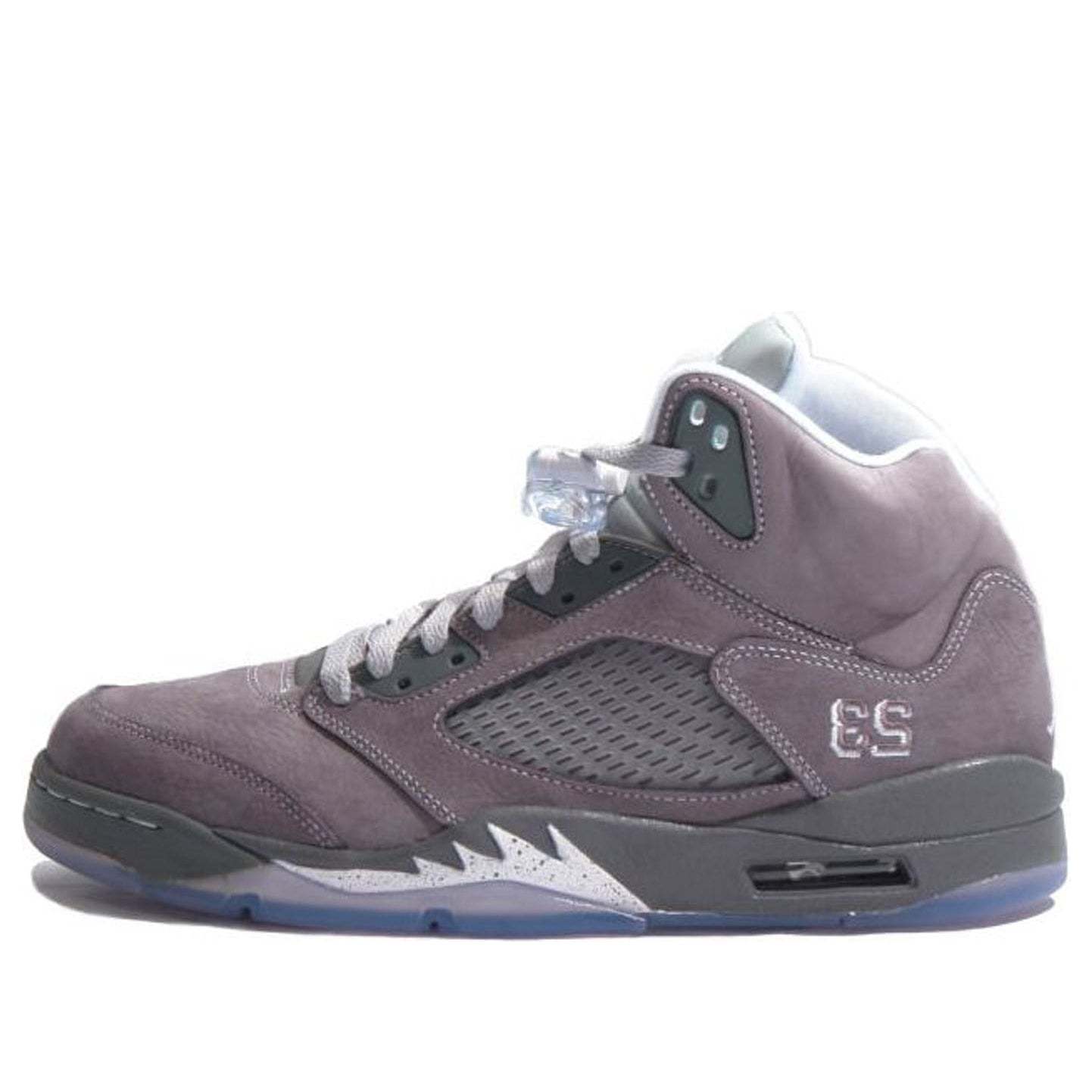The Air Jordan 5 Retro 'Wolf Grey' is a must-have for any sneakerhead. Released in May 2011, this sneaker features a Wolf Grey nubuck upper with Light Graphite accents and an embroidered '23' at the lateral ankle. The speckled white shark teeth and ice-blue translucent outsole give this sneaker a unique look that is sure to turn heads. Whether you're hitting the court or just hitting the streets, the Air Jordan 5 Retro 'Wolf Grey' is a must-have in your sneaker rotation.
