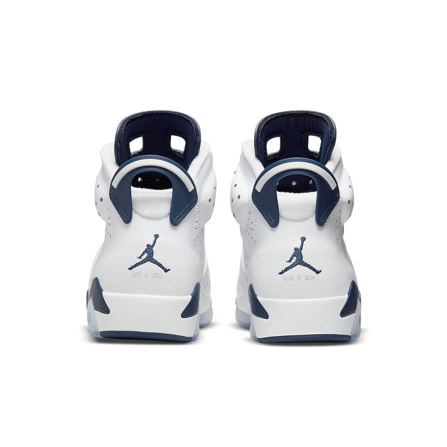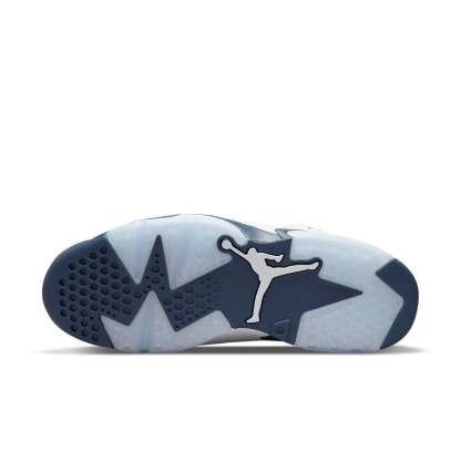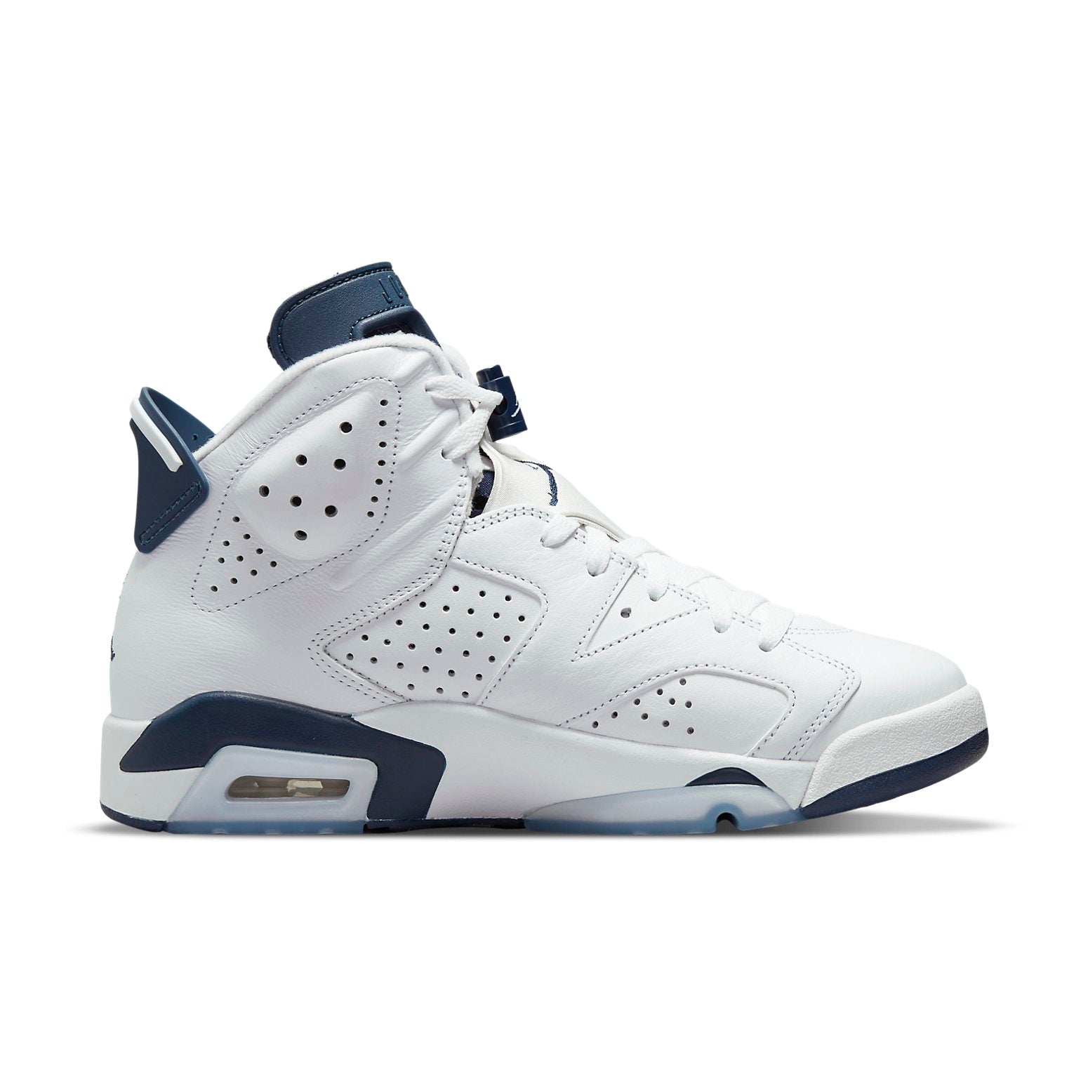The Air Jordan 6 Retro "Midnight Navy" 2022 is a classic colorway first seen in October 2000. It pairs a white leather upper with Midnight Navy hits on the molded tongue and heel tab. The color repeats on the Jumpman-branded lace lock, textile lace guard and back heel. The sneaker is mounted on a two-tone polyurethane midsole, fitted with an Air-sole unit in the heel. A translucent rubber outsole appears underfoot.