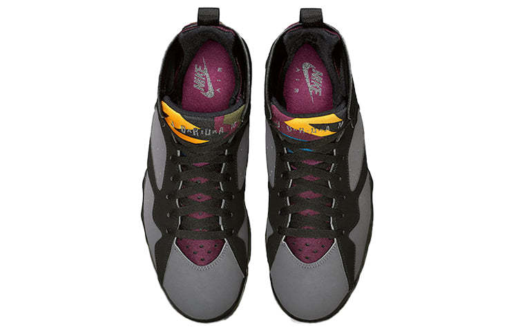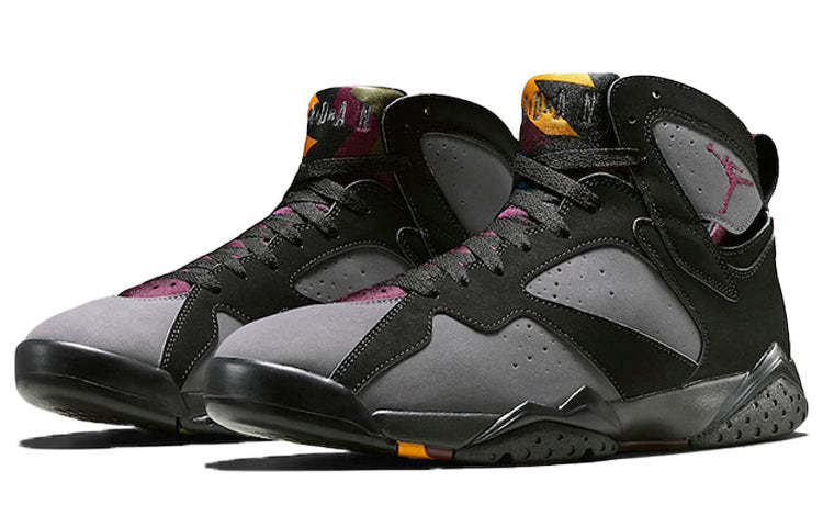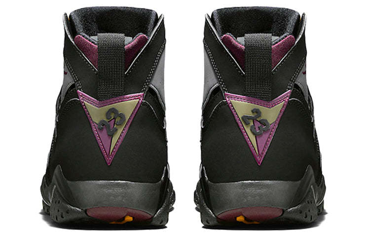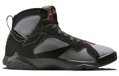 This Air Jordan 7 Bordeaux 2015 dressed a grey and black upper that is finished with bright and vibrant accents. The back of the heel features a v-shaped emblem with his Airness’ number on it ’23’, as well as a similar accented design found on the outsole.