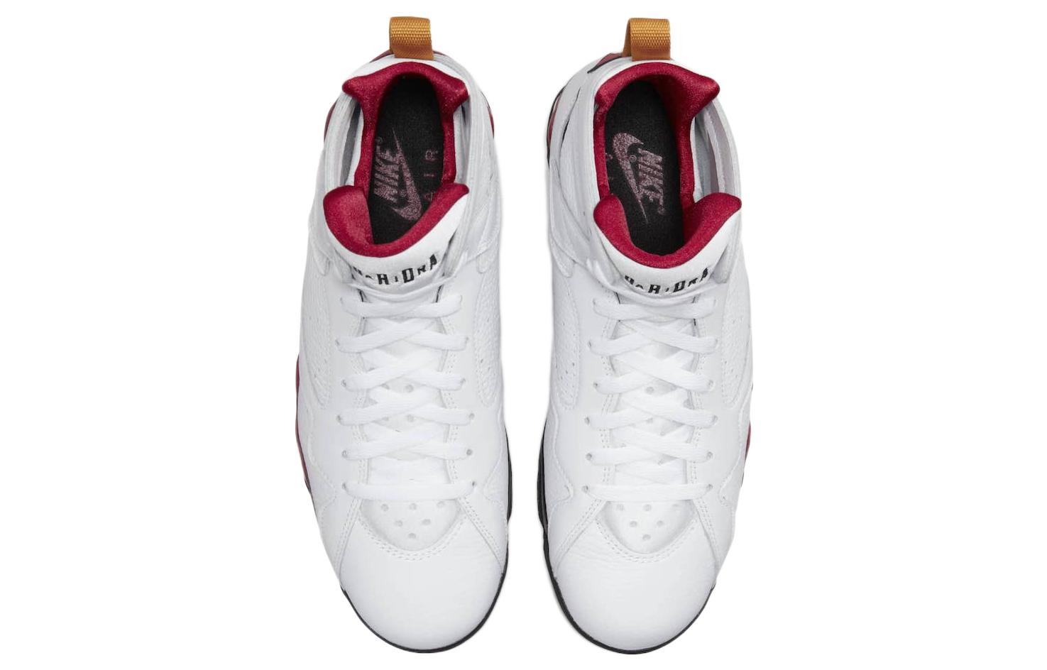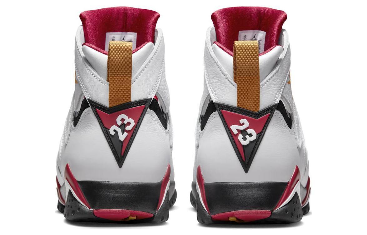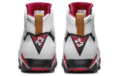 The Air Jordan 7 Retro 'Cardinal' 2022 is a stylish sneaker for adults. It features a white leather upper with perforations and accents in cardinal red and black. The design is complete with a golden Jumpman logo and heel tab. The inspiration behind the design is the traditional bishop's robes, with the cardinal red and chutney colors representing the colors of the robes. The rubber sole provides comfort and durability, making it perfect for everyday use. This sneaker is a must-have for any Air Jordan fan.