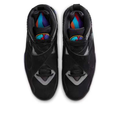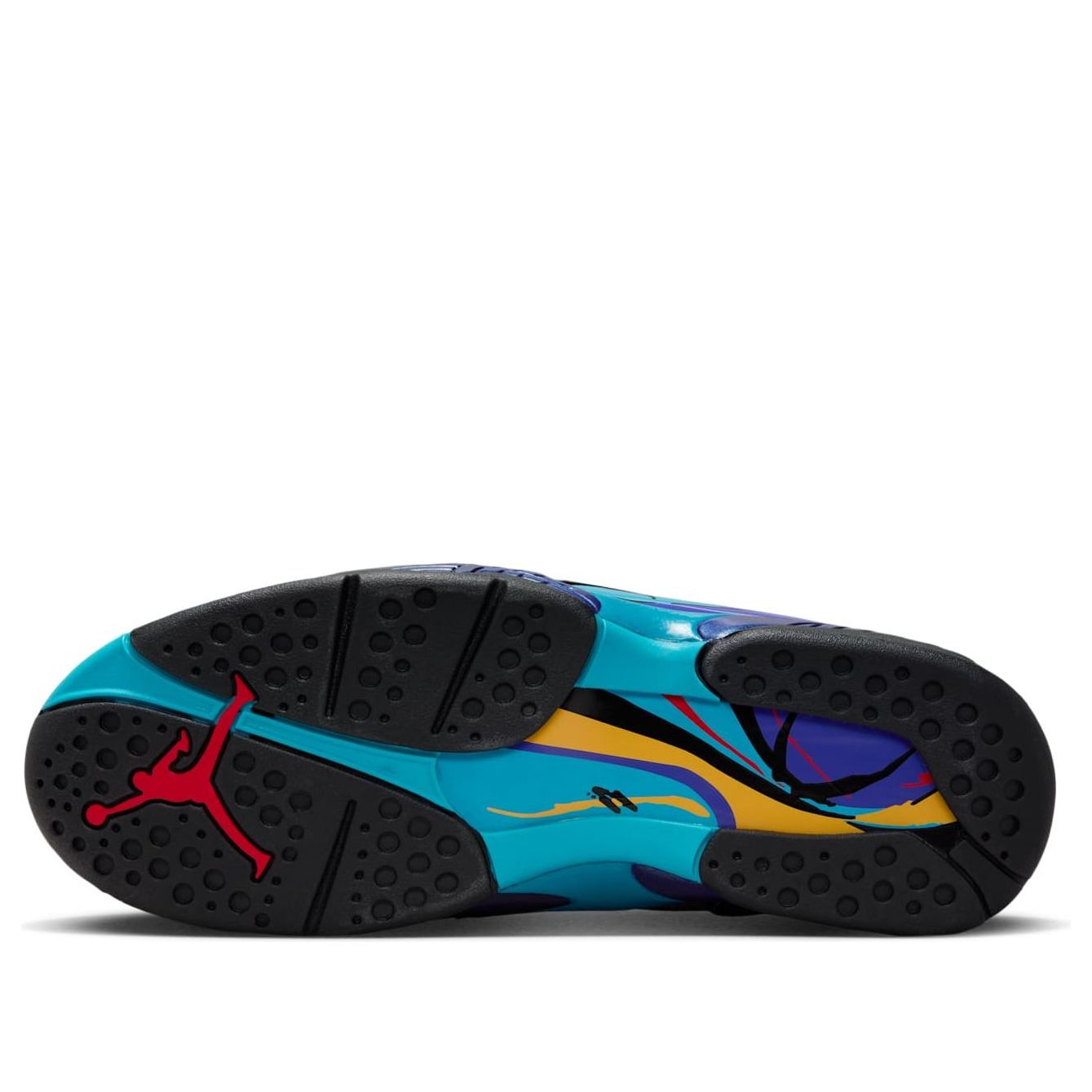 The highly anticipated Air Jordan 8 'Aqua' is back! This iconic colorway returns with its original blue and purple accents against a black and gray base, faithfully recreating the beloved design details.