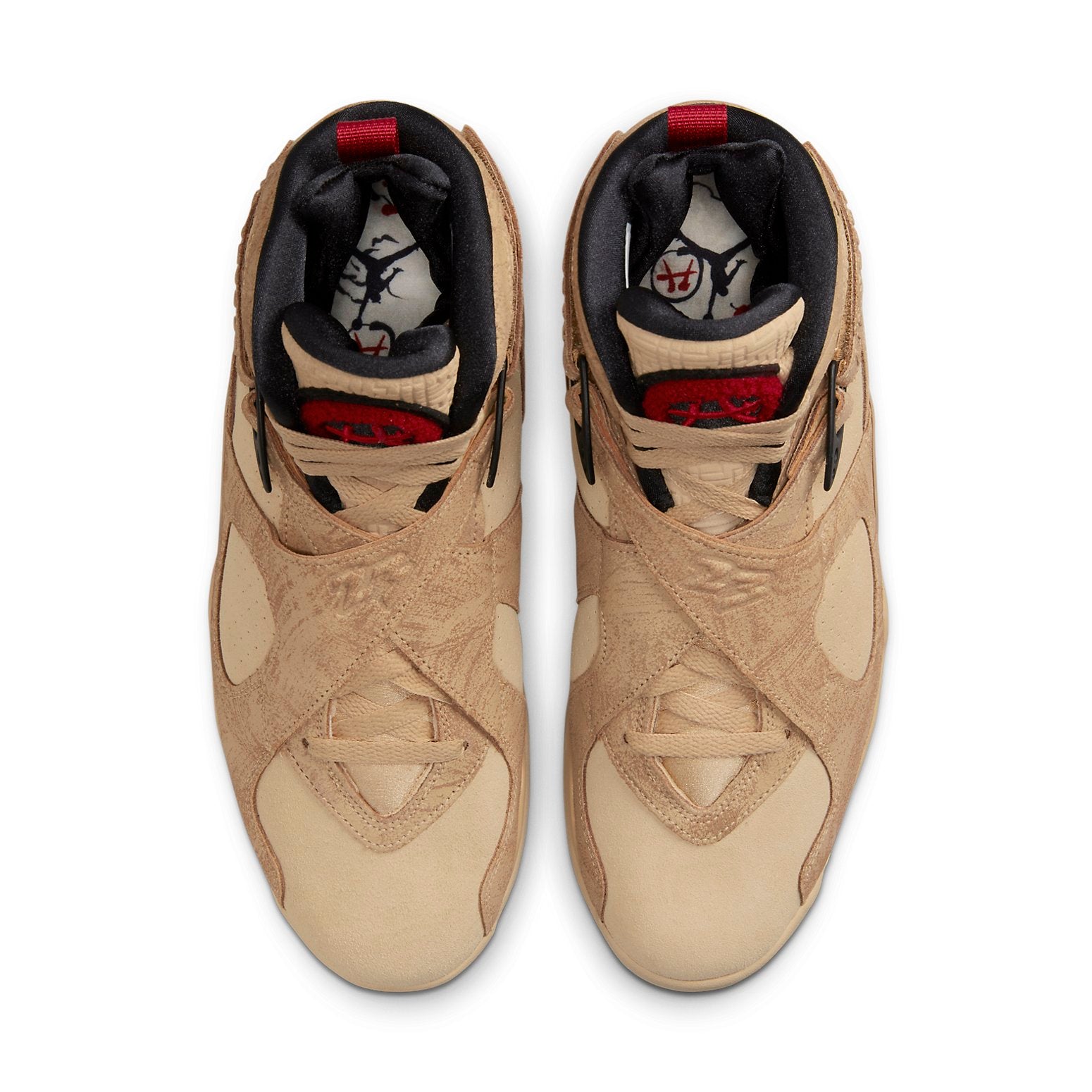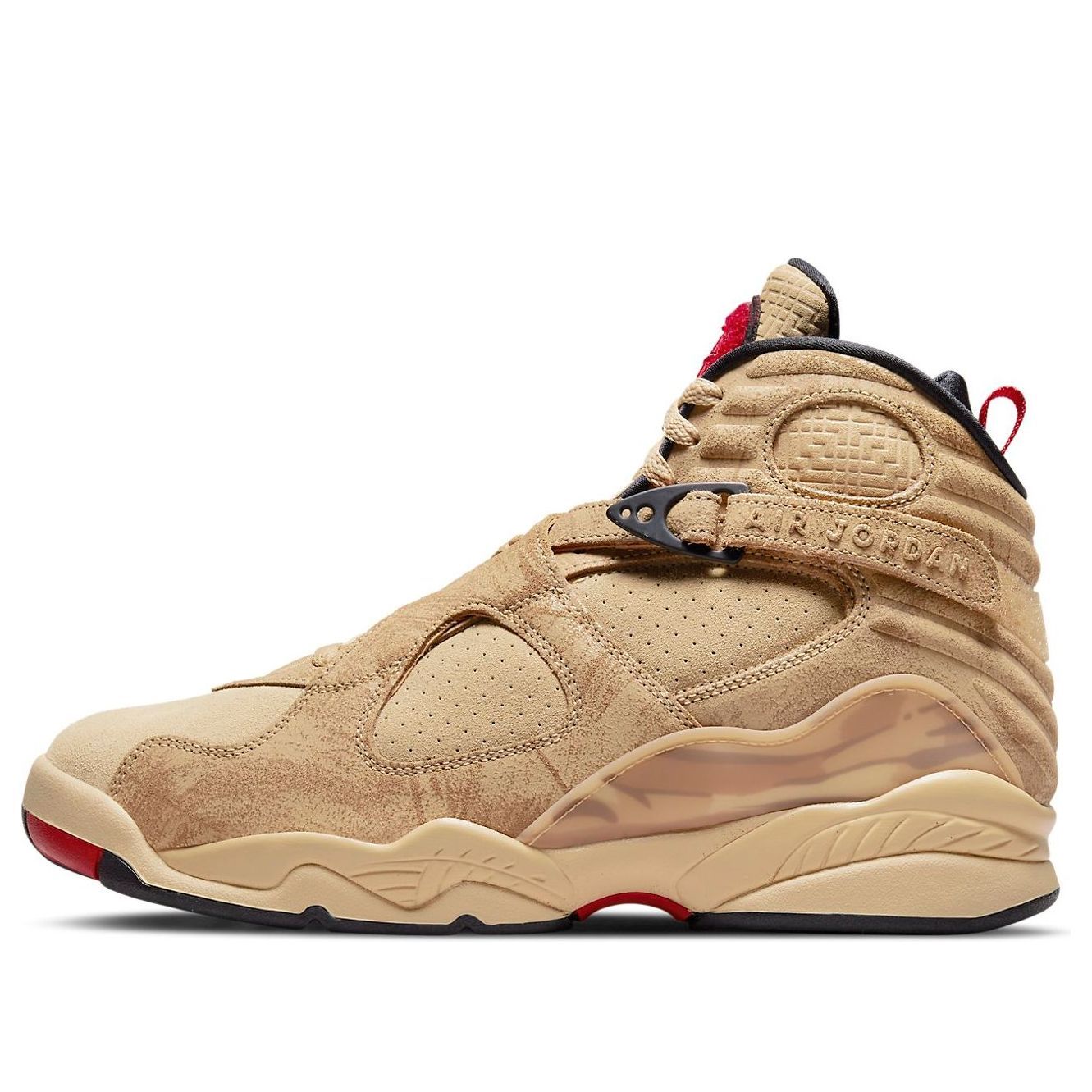 A look at the Nike Air Jordan 8 Retro SE reveals a sneaker that is both stylish and comfortable. This shoe was designed for NBA athlete Rui Hachimura and features a tan suede upper with perforated detailing and tonal patterned overlays. The 8's signature details remain intact, including the unique cross-strap design, printed mudguard, and chenille tongue patch, updated here in red with Rui's personal logo. The sneaker rides on a matching tan polyurethane midsole with encapsulated Nike Air cushioning in the forefoot and heel, providing superior comfort whether you're on the court or just running around town. So grab a pair of these stylish and comfortable sneakers today.