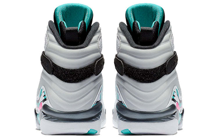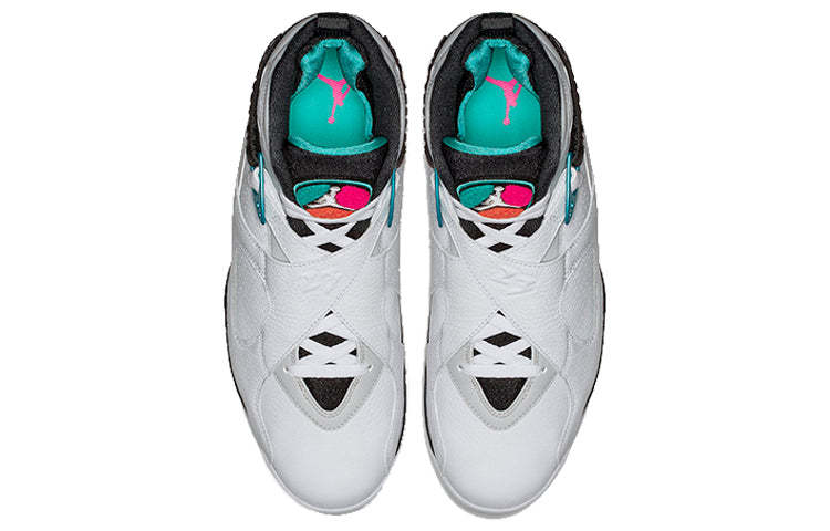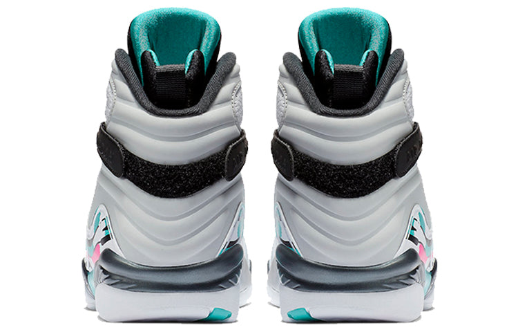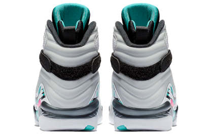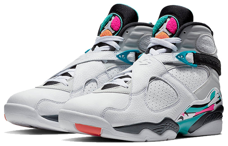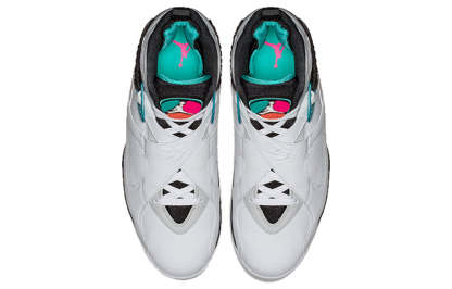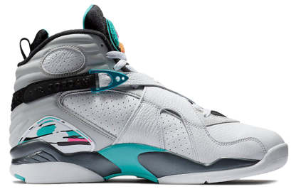 The Air Jordan 8 Retro 'South Beach' is a radical departure from the silhouette's OG Chicago Bull colorways. A white leather upper with perforated paneling on the quarter panel is accented with overlays adorned with streaks of Turbo Green and pink. The AJ8's signature chenille tongue patch is similarly done up in teal, pink and orange. This unique colorway is sure to turn heads and make a statement.
