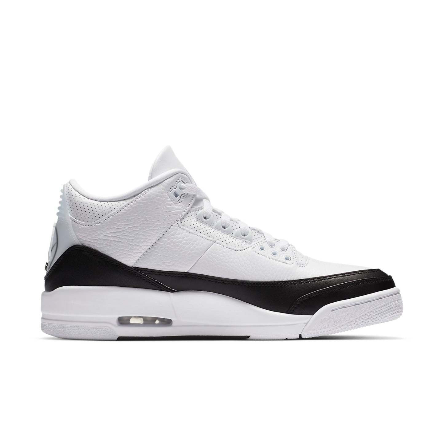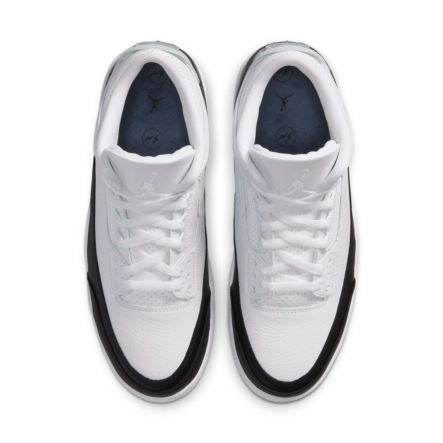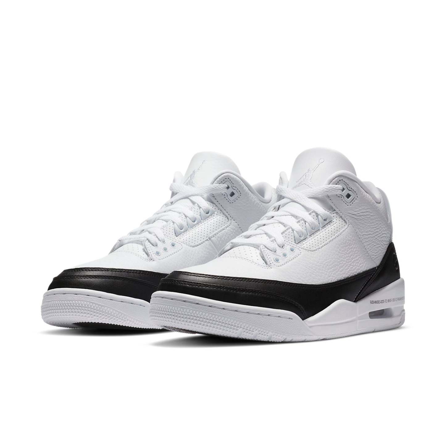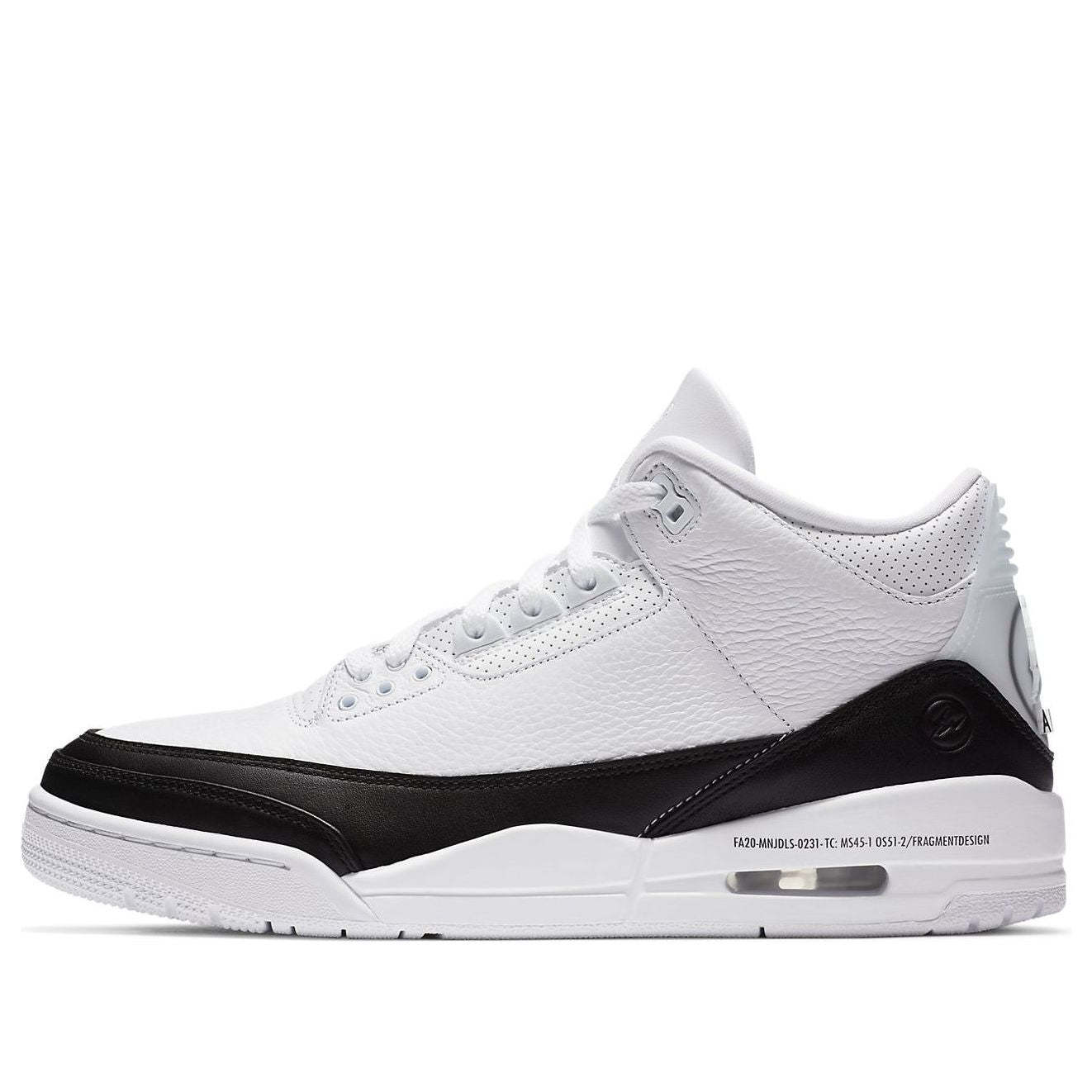 The fragment design x Nike Air Jordan 3 Retro SP truly embodies the motto "Less is more". The monochromatic pair features a white tumbled leather base and black lather across the mudguard and heel. The branding on this pair is done subtly in the forms of stitched-on Jumpman logo and style code on the midsole. On the heel, a translucent heel tab reveals the fragment thunderbolt logo.