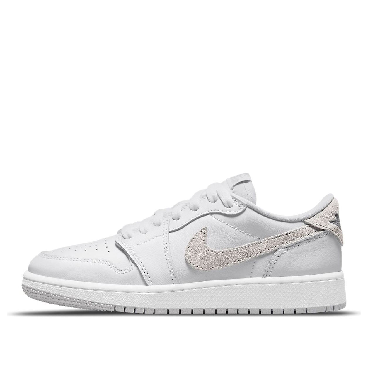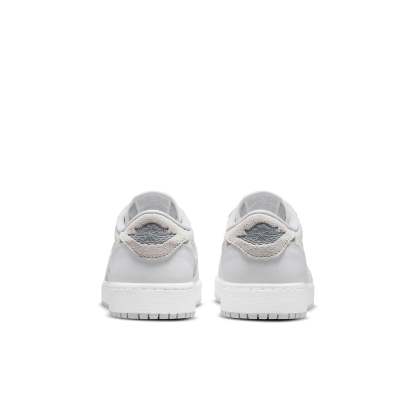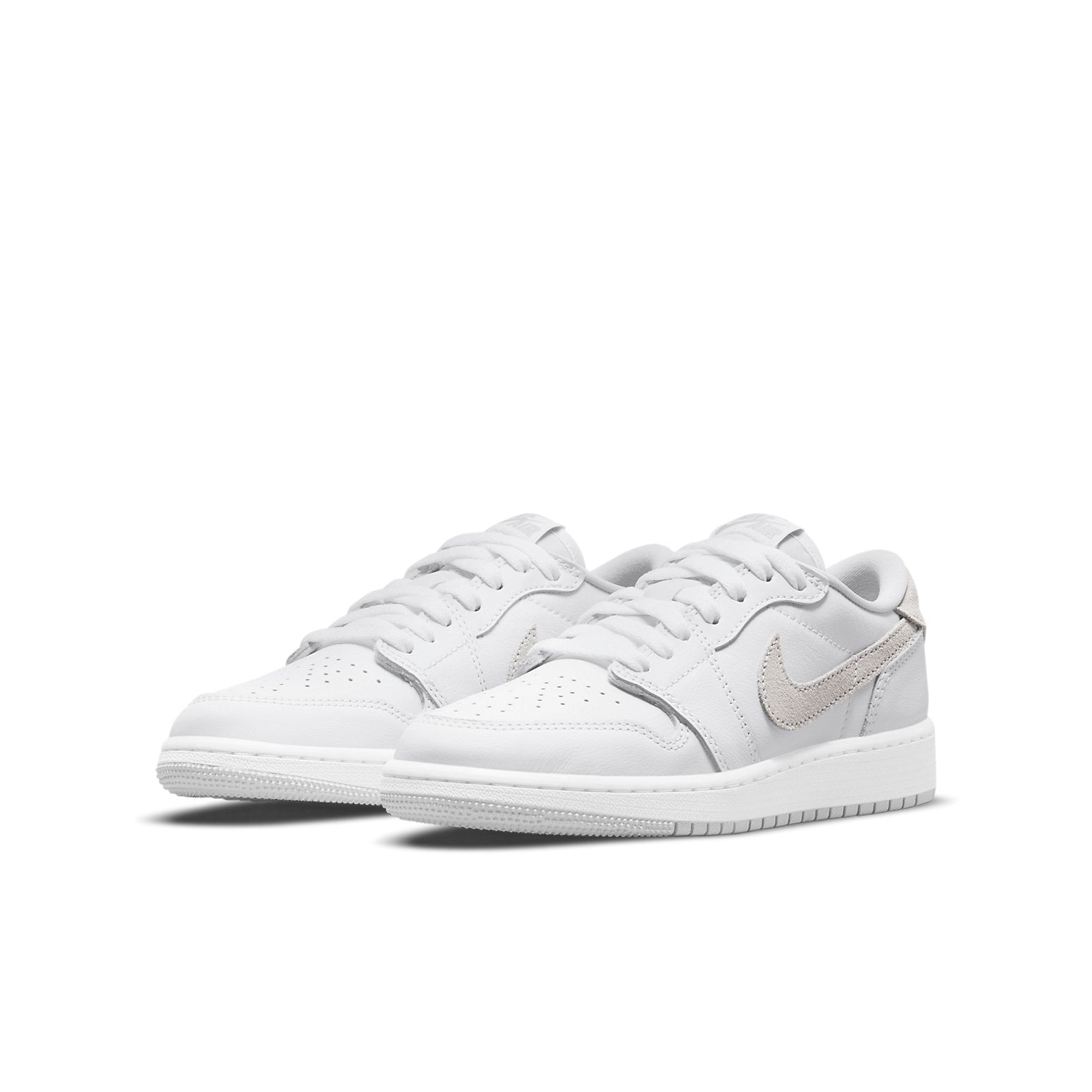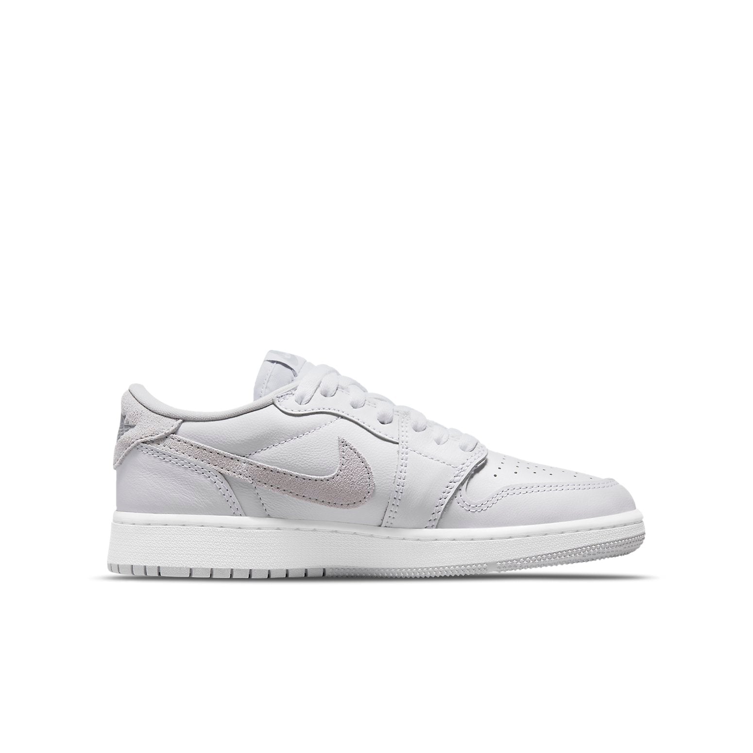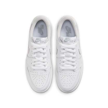 The Air Jordan 1 Retro Low OG GS (3.5y-7y) 'Neutral Grey' brings back the original 1985 colorway of Michael Jordan's first signature shoe. The low-top silhouette is crafted with a white leather upper and vintage light grey suede overlays on the signature Nike Swoosh and heel tab. The heel tab is also stamped with a Jordan Wings logo, while Nike Air branding appears on the sockliner and woven tongue tag. Finally, the shoe rests on a rubber cupsole for traction and cushioning, with an encapsulated Air-sole unit in the heel for added comfort.