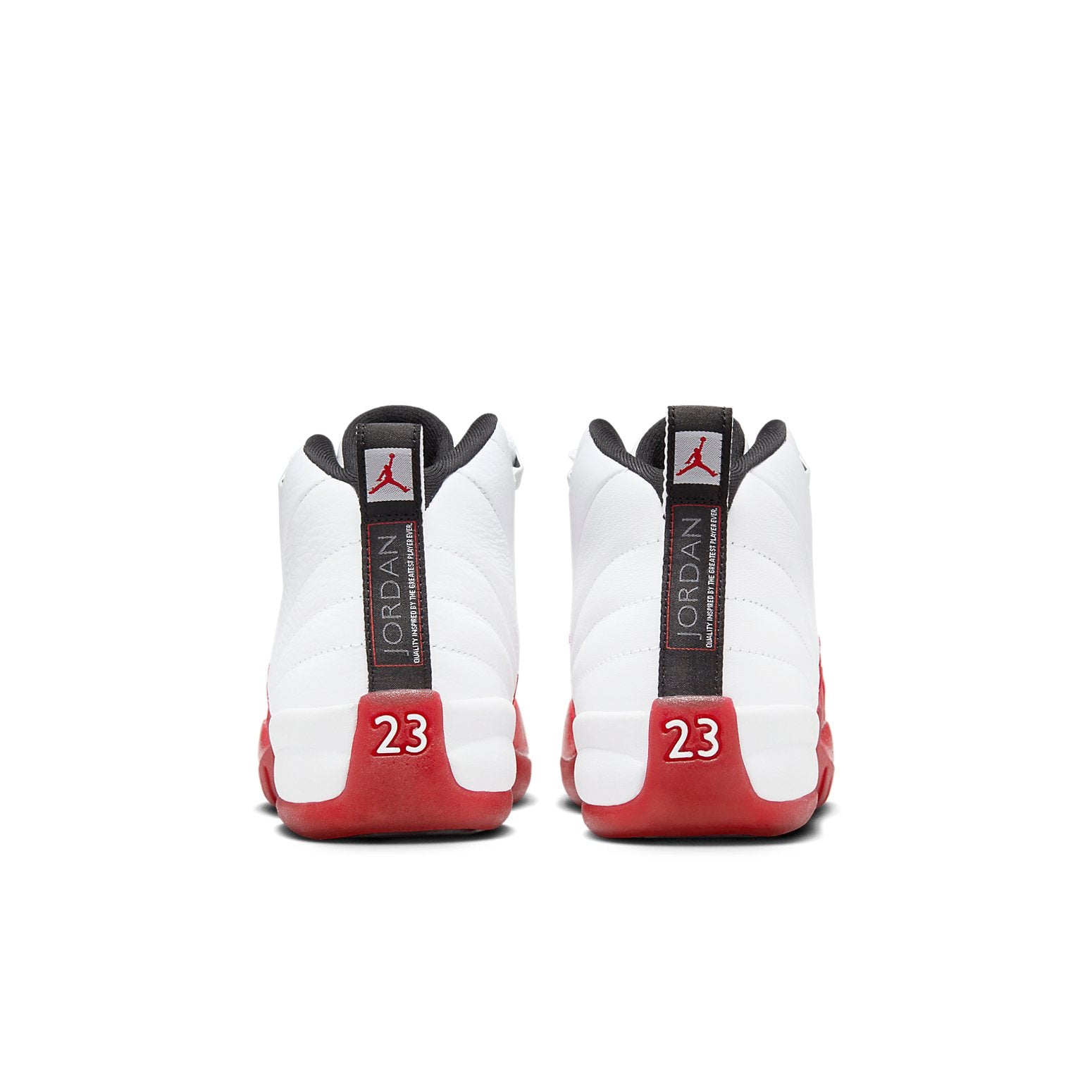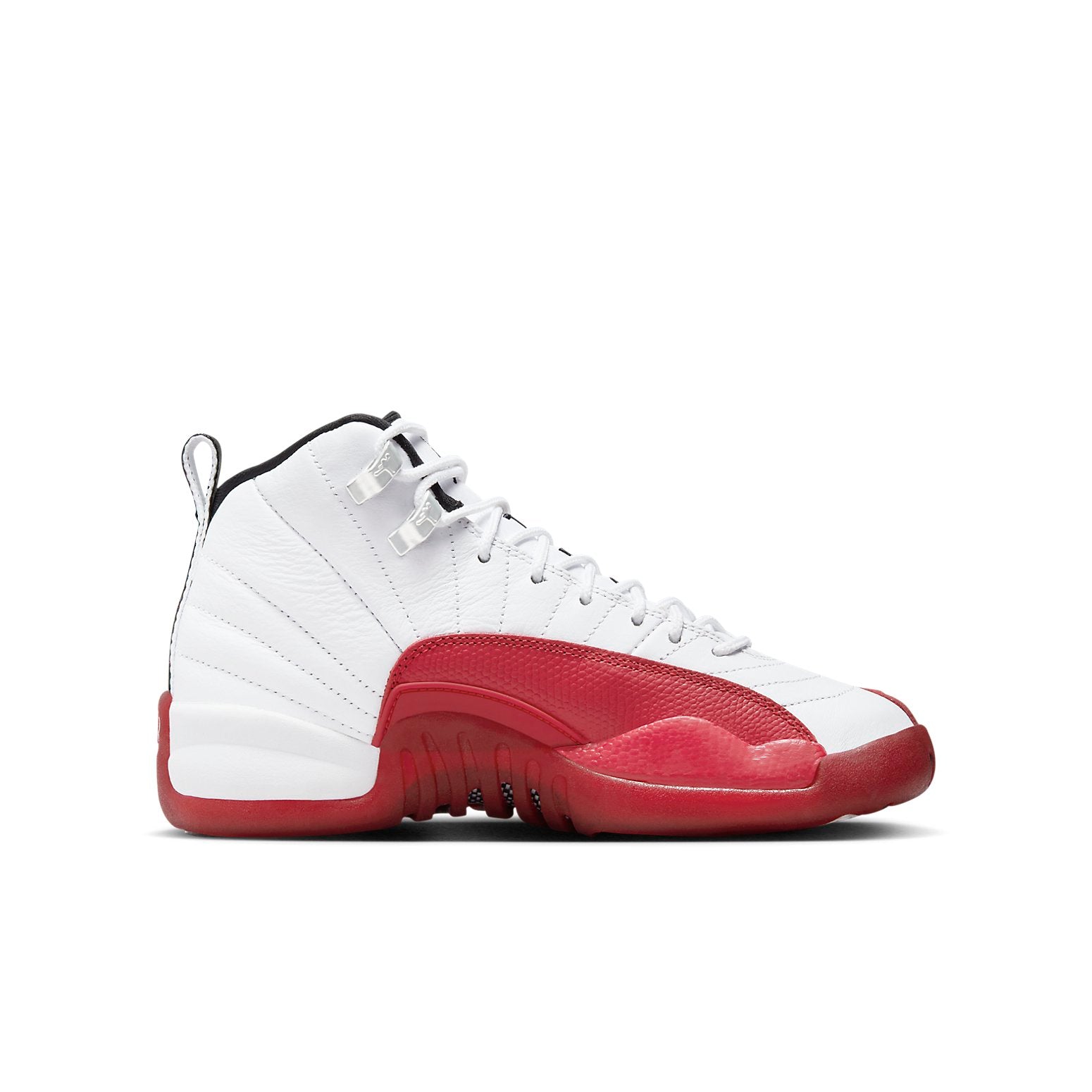 The Jordan 12 Retro Cherry (GS) (2023) is a grade school-sized version of the iconic Jordan 12, featuring a vintage-inspired tri-tone colorway of white, varsity red, and black. Inspired by the original 1996-1997 NBA season shoe, this retro model boasts lizard skin-textured overlays, Zoom Air cushioning, and a herringbone outsole. Minimal branding adds to its sleek design, making it a stylish and comfortable choice for young sneakerheads.