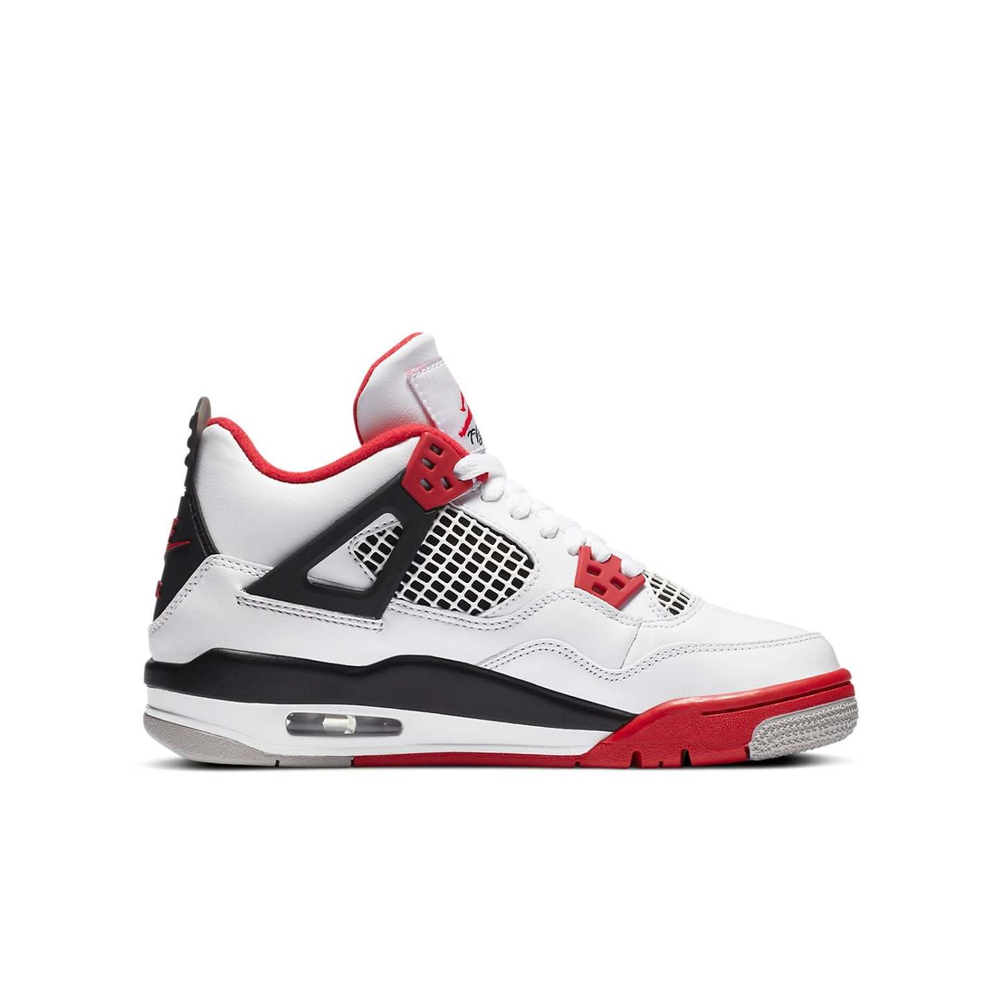 The Air Jordan 4 Retro OG GS 'Fire Red' 2020 is a reissue of an iconic silhouette that originally debuted in 1989. Made for big kids, this sneaker features a white leather upper with contrasting black and red accents throughout. Jumpman branding atop the tongue is complemented by a Nike logo on the back heel, making this a must-have sneaker for any Air Jordan fan.
