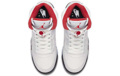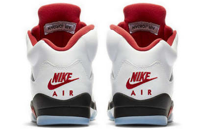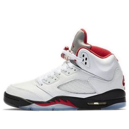 The Air Jordan 5 Retro GS ‘Fire Red’ is a must-have for any young sneakerhead. This reissue of an OG colorway is true to the original, with a white leather upper, silver reflective tongue, and Nike Air stitched on the heel. The defining feature of this shoe is the red shark tooth design inspired by the P-51 Mustang WWII fighter plane, which can be seen on the black midsole. The clear translucent rubber outsole finishes the look and provides durability.
