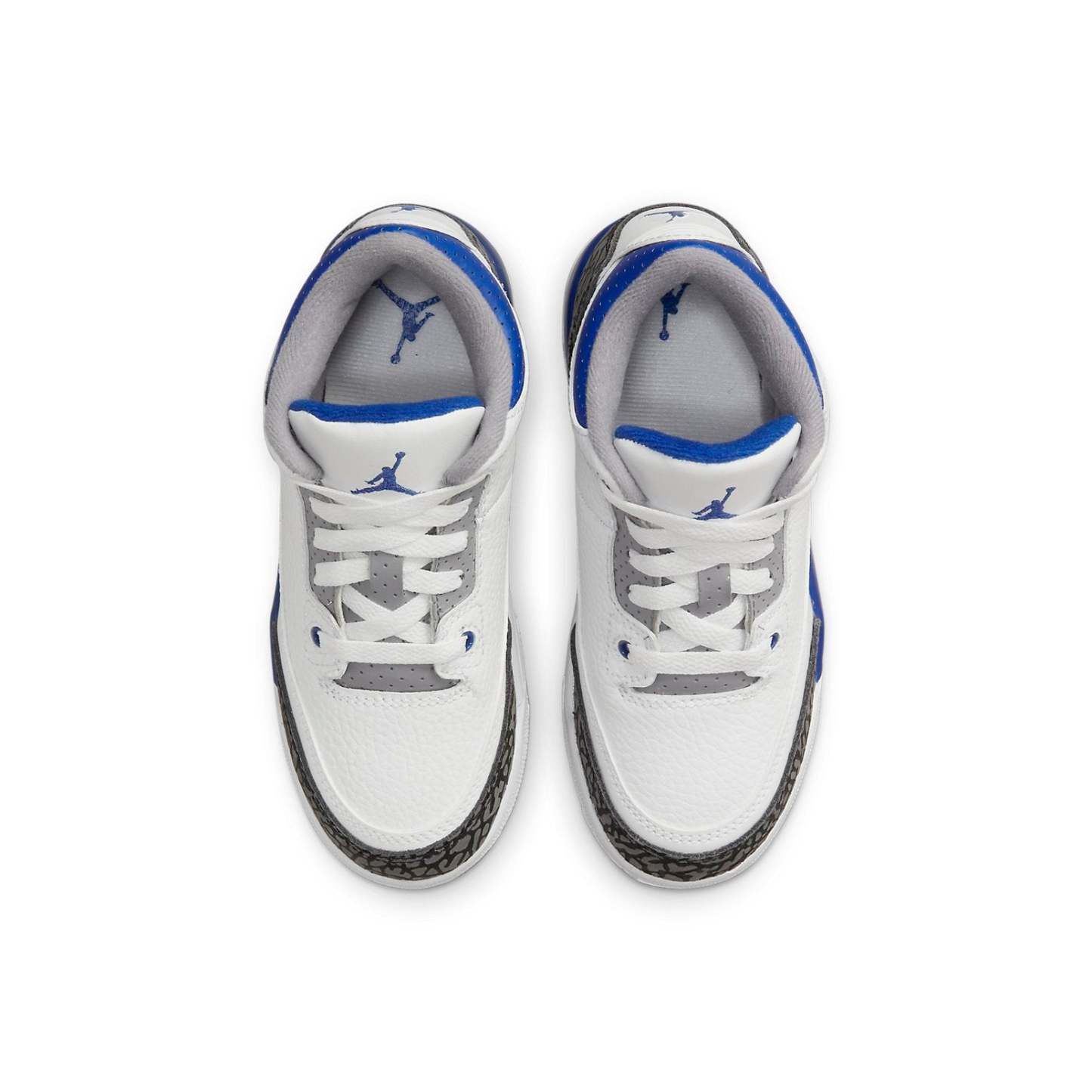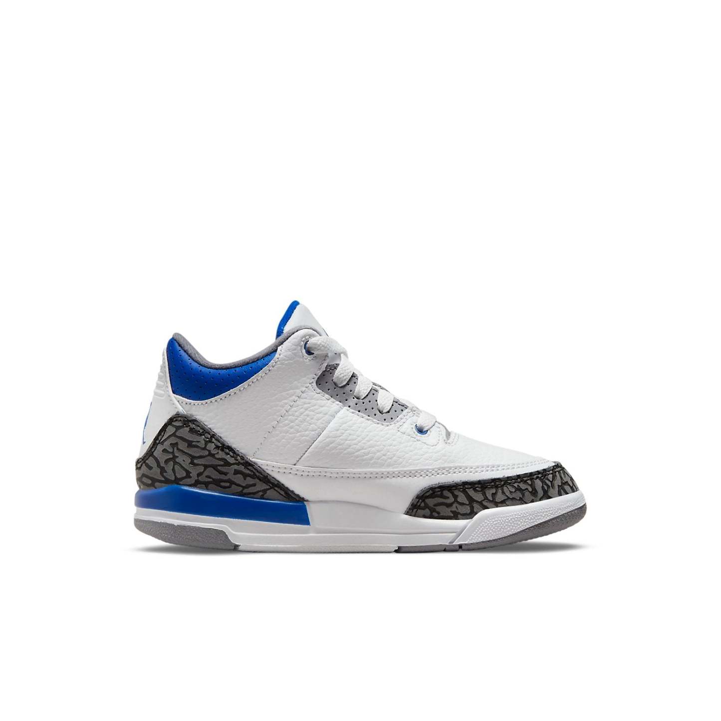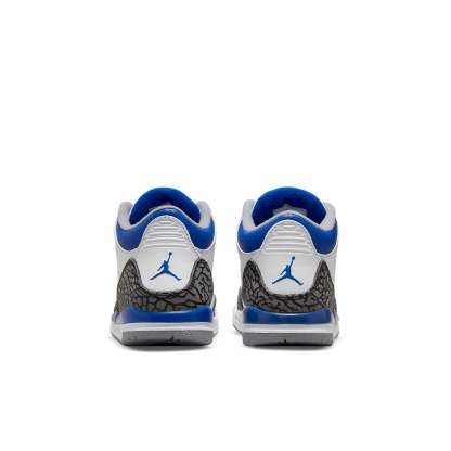 The Air Jordan 3 Retro PS 'Racer Blue' is a must-have sneaker for any little Jordan fan. Featuring classic color blocking and the iconic elephant print, this sneaker is sure to make a statement. The dark grey finish is accented by royal blue details, making for a sneaker that is both eye-catching and stylish. The tumbled white leather upper provides a unique look, while the reinforced eyelets provide durability and support. The Jumpman branding on the tongue and heel add a finishing touch to this already iconic sneaker.